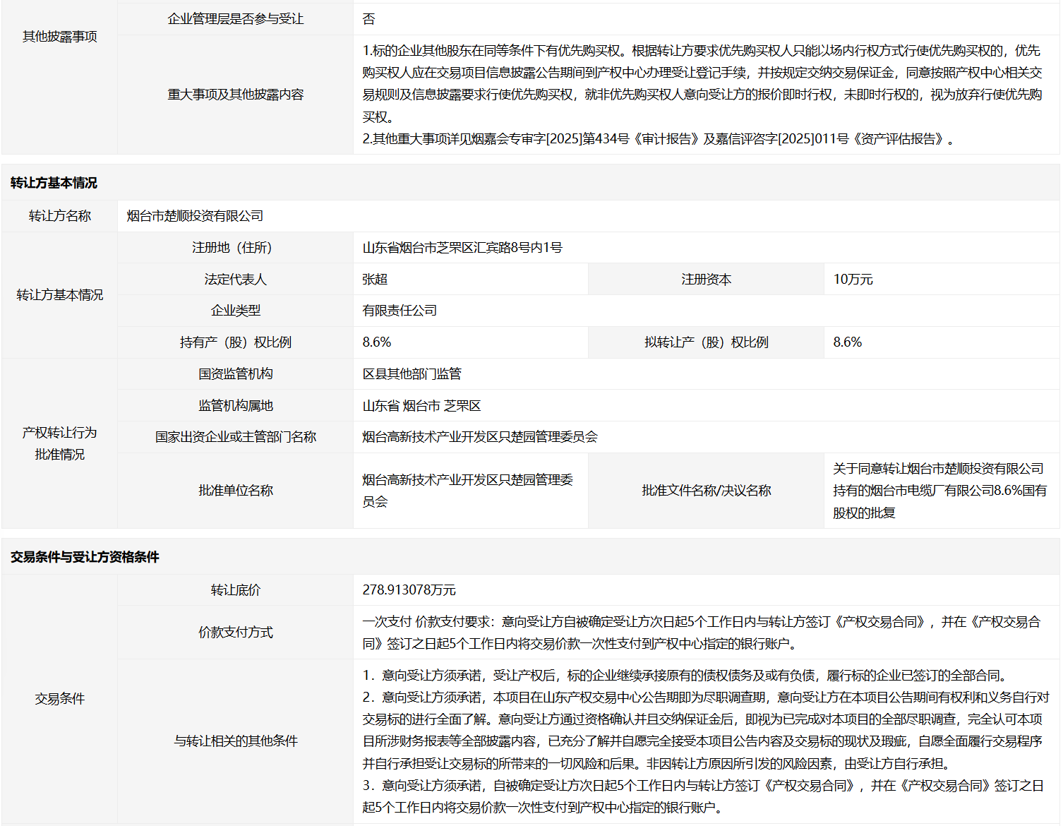 煙臺市電纜廠有限公司8.6%國有股權(quán)