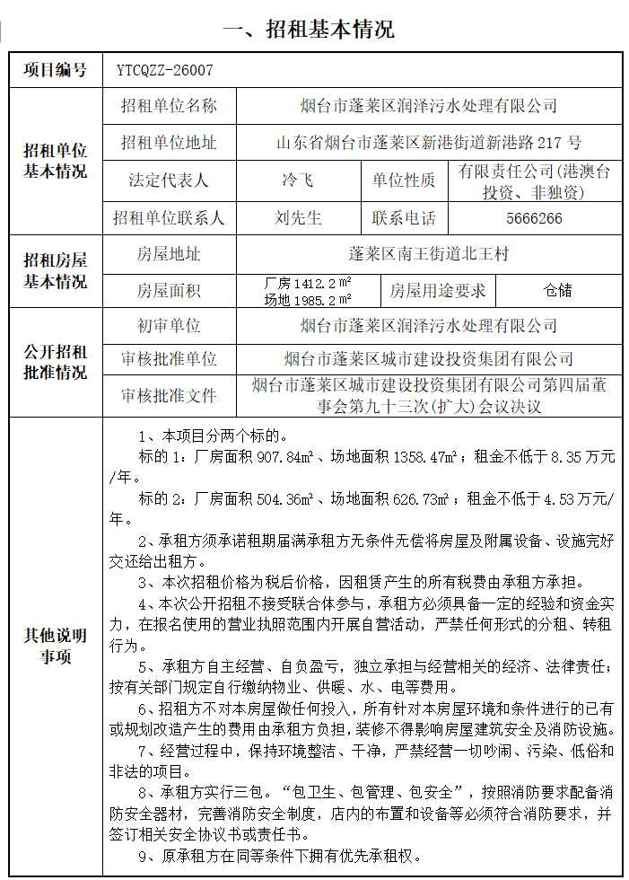蓬萊區(qū)南王街道北王村北王汽修廠北院招租公告